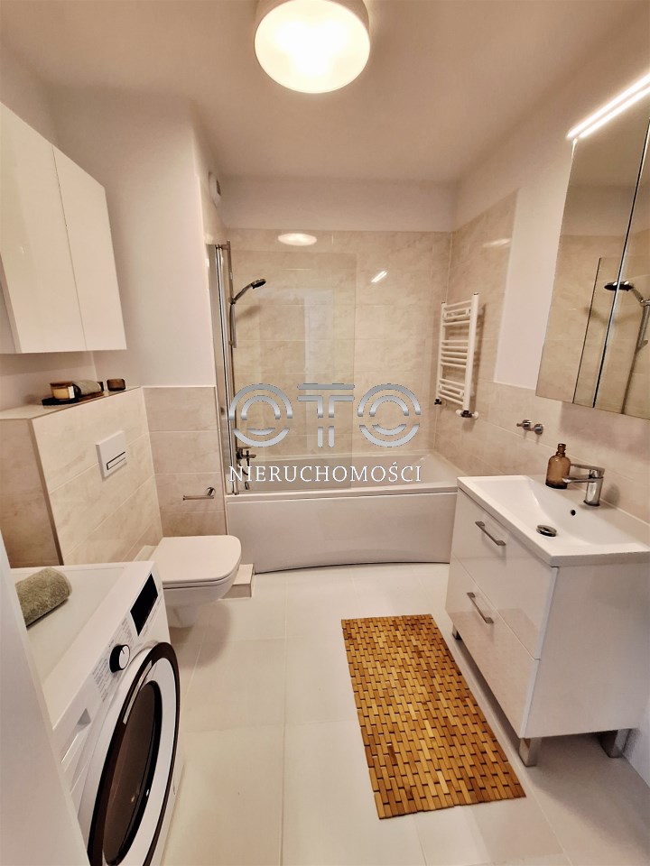 Łazienka: wanna ze szklanym parawanem, pralka,